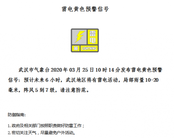 武汉市气象台2020年03月25日10时14分发布雷电黄色预警信号:预计未来6小时,武汉地区将有雷电活动,局部雨量10-20毫米,阵风5到7级,请注意防范。