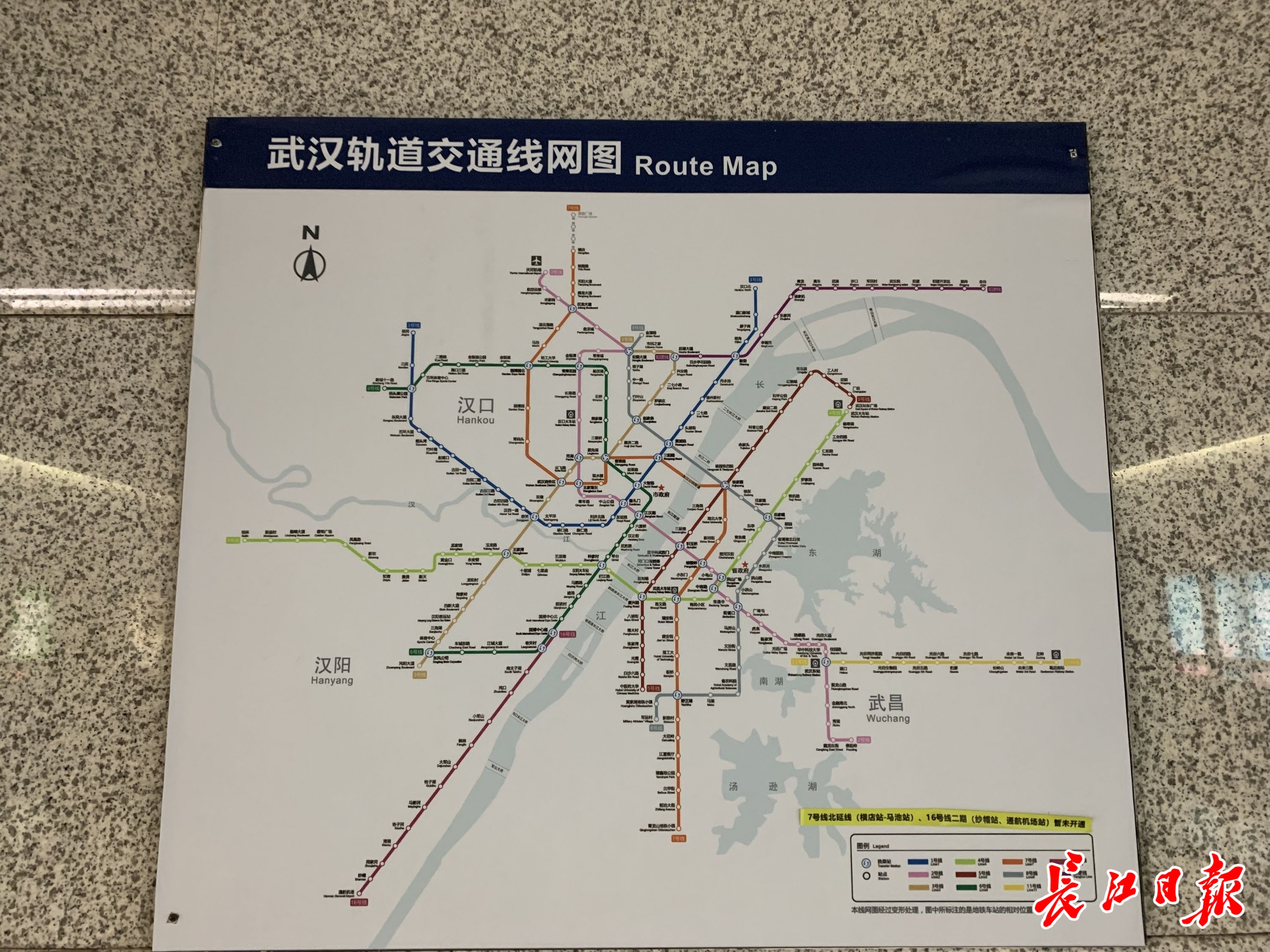 中午,在3号线市民之家站,记者在站台看到一张新的武汉轨道交通线网图,上面的7号线延长了,增加了7号线北延线(前川线)一期的7个站点和16号线二期的2个站点。运营图下方还贴有一张黄色纸条,上面写着“7号线北延线(横店站-马池站)、16号线二期(纱帽站、通航机场站)暂未开通”。