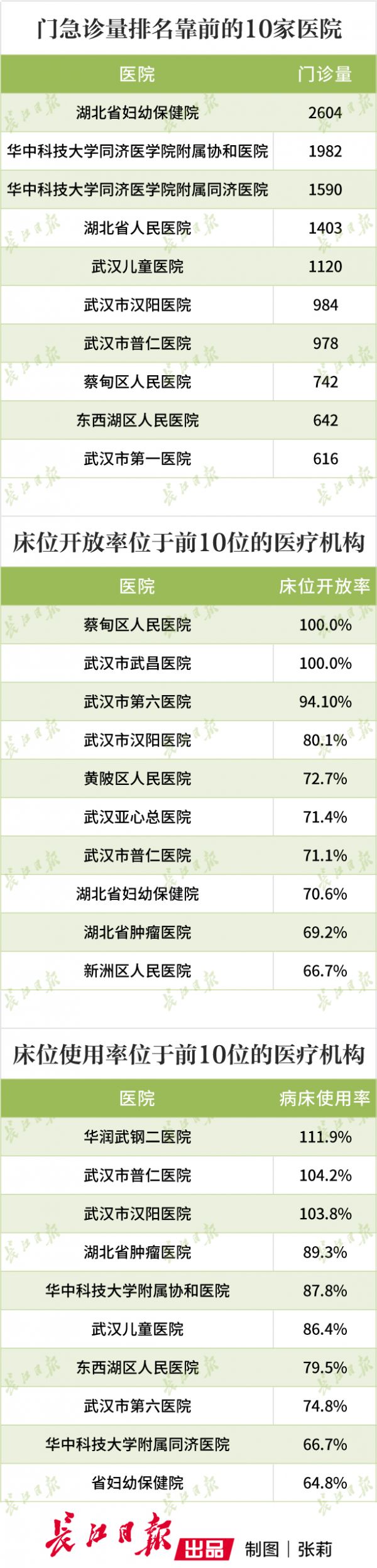 床位使用率位于前10位的医疗机构为:华润武钢二医院(111.9%)、武汉市普仁医院(104.2%)、武汉市汉阳医院(103.8%)、湖北省肿瘤医院(89.3%)、华中科技大学附属协和医院(87.8%)、武汉儿童医院(86.4%)、东西湖区人民医院(79.5%)、武汉市第六医院(74.8%)、华中科技大学附属同济医院(66.7%)、省妇幼保健院(64.8%)。