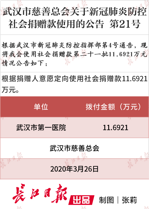 其中,第21批使用社会捐赠款11.69万元为定向捐赠给武汉市第一医院,后续使用社会捐赠款情况将陆续公布。同时,武汉市慈善总会将依法依规依程序公开透明使用社会捐赠款,欢迎社会各界监督。