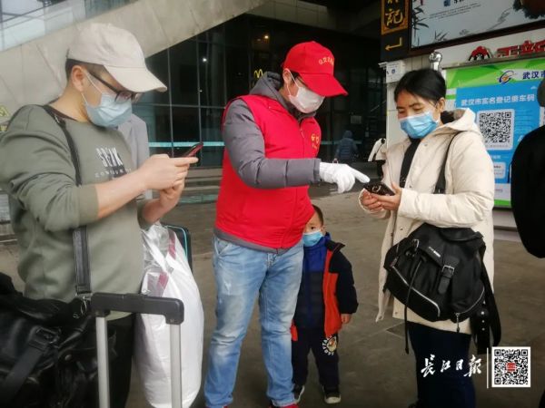 3月27日15时许,武汉站东出站口附近,武汉公交志愿者为乘客做健康码、实名登记乘车等引导工作
