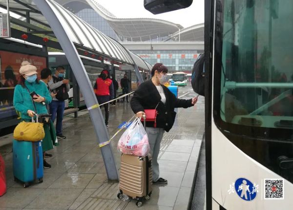 3月27日14时许,武汉站公交枢纽站,乘客正在有序排队扫码乘车