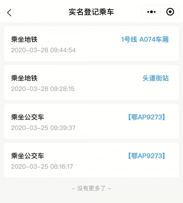 比如根据下图这位乘客“实名登记乘车”小程序中的数据,我们可以看到,他于3月25日8时16分搭乘车牌号为鄂A·P9273的公交车,9时39分下车。3月28日9时28分,他从头道街站进站,搭乘了地铁1号线,所在车厢为A074号,并于9时44分下车。