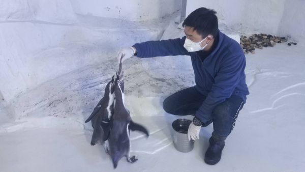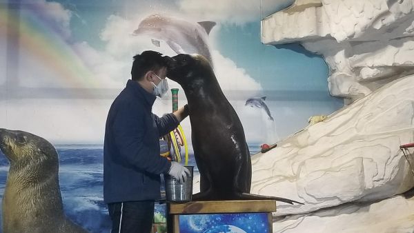 东湖海洋世界内,留守的饲养员照顾动物 通讯员刘良俊 供图