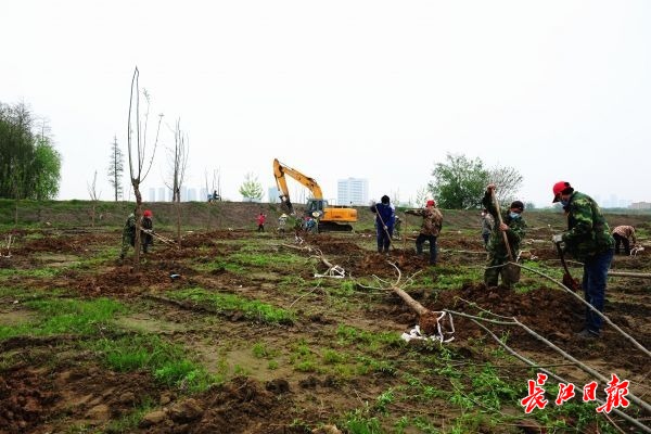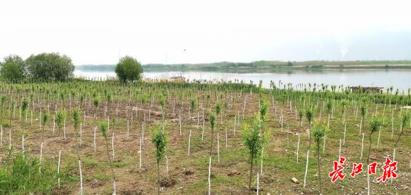 汉江两岸植树造林主战场在汉江北岸的东西湖区,任务1500余亩。去年已完成700余亩,今年将完成剩下的800亩。在东西湖区慈惠街白鹤嘴造林段,去年底种下的5000株水杉、池杉已吐出新绿。旁边一块整理好的土地上,园林工人和一台挖机正合力种植330株旱柳。