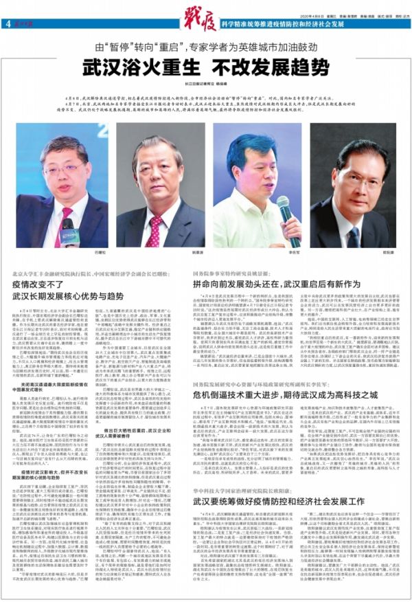 4月7日,北京、武汉两地知名专家学者接受长江日报记者专访时表示,武汉正迎来浴火重生,虽然疫情对武汉短期内形成巨大冲击,但是武汉长期发展向好的趋势不变。武汉仍处于战略发展机遇期,英雄的城市和英雄的人民,将满怀着英雄气概,最终将夺取疫情防控和经济社会发展双胜利。