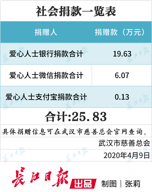 长江日报-长江网4月10日讯(记者杨帆 通讯员汪亮)1月23日,武汉市新冠肺炎防控指挥部发布第4号通告,武汉市慈善总会负责接受捐款和通用物资。现将4月8日-9日(4月8日12:00—4月9日12:00)武汉市慈善总会接收捐赠款物公示如下(具体款物使用和分配方案随后公布):