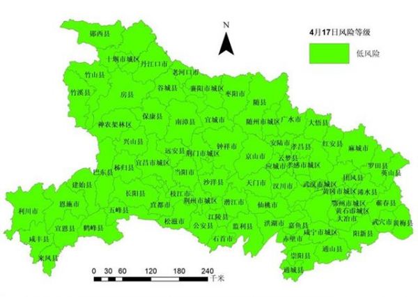 依据国务院应对新型冠状病毒感染肺炎疫情联防联控机制《关于科学防治精准施策分区分级做好新冠肺炎疫情防控工作的指导意见》中的风险划定标准,经省疾控中心组织专家评估,截至4月17日24时,全省低风险市县76个,无中、高风险市县。武汉市13个城区中,均为低风险区,无中、高风险区。