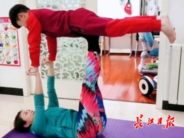 武汉体育学院唐海英老师和儿子一起做运动 唐海英供图