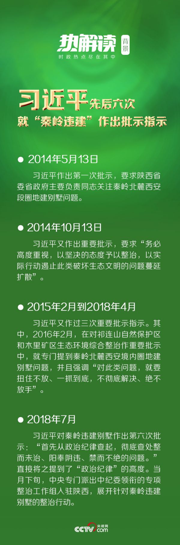从2014年5月到2018年7月,习近平先后六次就“秦岭违建”作出批示指示。