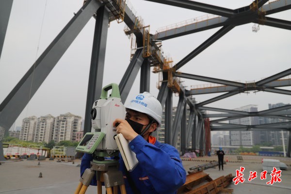 4月23日上午,江汉七桥主拱钢梁架设现场, 测量员曹广成和彭聪用国内精度最高的全站仪精准定位杆件姿态 记者杨涛 韩玮 摄