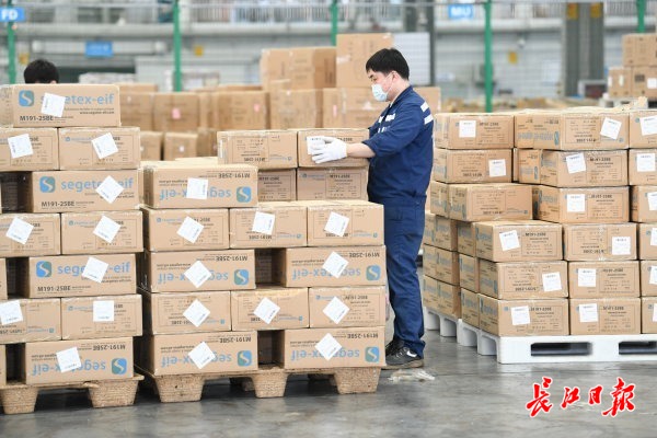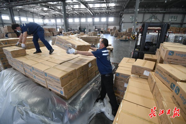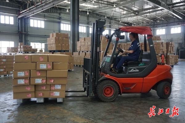 长江日报-长江网4月27日讯(记者王谦 詹松)4月26日上午,武汉天河机场国际货站一片繁忙,长江日报-长江网记者看到,出港处堆满了刚刚从各地运来的货物,约1万平方米的仓库里处处可见码放的纸箱和集装板,装卸工正有序地对货物进行装机前的打板操作,数台叉车在场内外来回搬运。