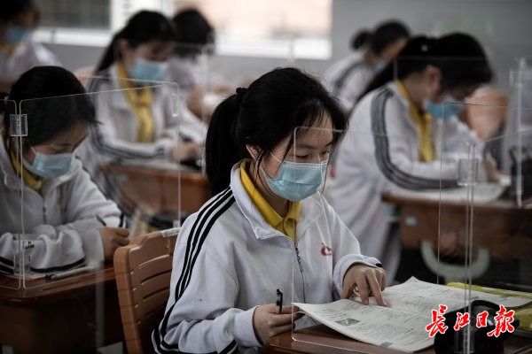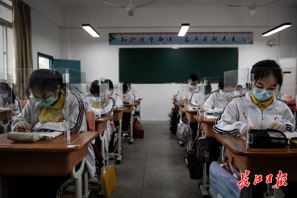 长江日报-长江网5月6日讯 5月6日,武汉市第二十三中学的高三年级学生在教室自习。武汉市第二十三中学为高三年级的540名复学学生准备了透明隔板,以阻断交流、就餐时可能产生的飞沫。当日,武汉首批121所学校高三年级正式复学,学生返校上课。 (记者任勇 摄影报道)