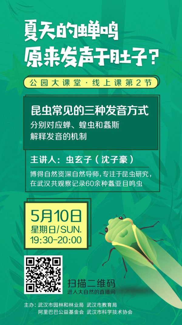 公园大课堂线上课由武汉市园林和林业局、武汉市教育局、阿里巴巴公益基金会和武汉市科学技术协会联合主办,在受新冠肺炎疫情影响,将暂时不方便抵达的自然科普场景搬到线上的同时,也将尝试通过线上课程方式,突破线下活动参与人数、场地等局限,进一步拓展学习空间,辐射自然科普的影响面。