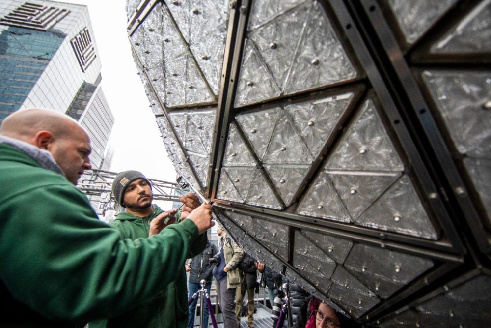 2019年12月27日,在美国纽约,工人在曼哈顿时报广场安装水晶球。(新华社记者王迎摄)