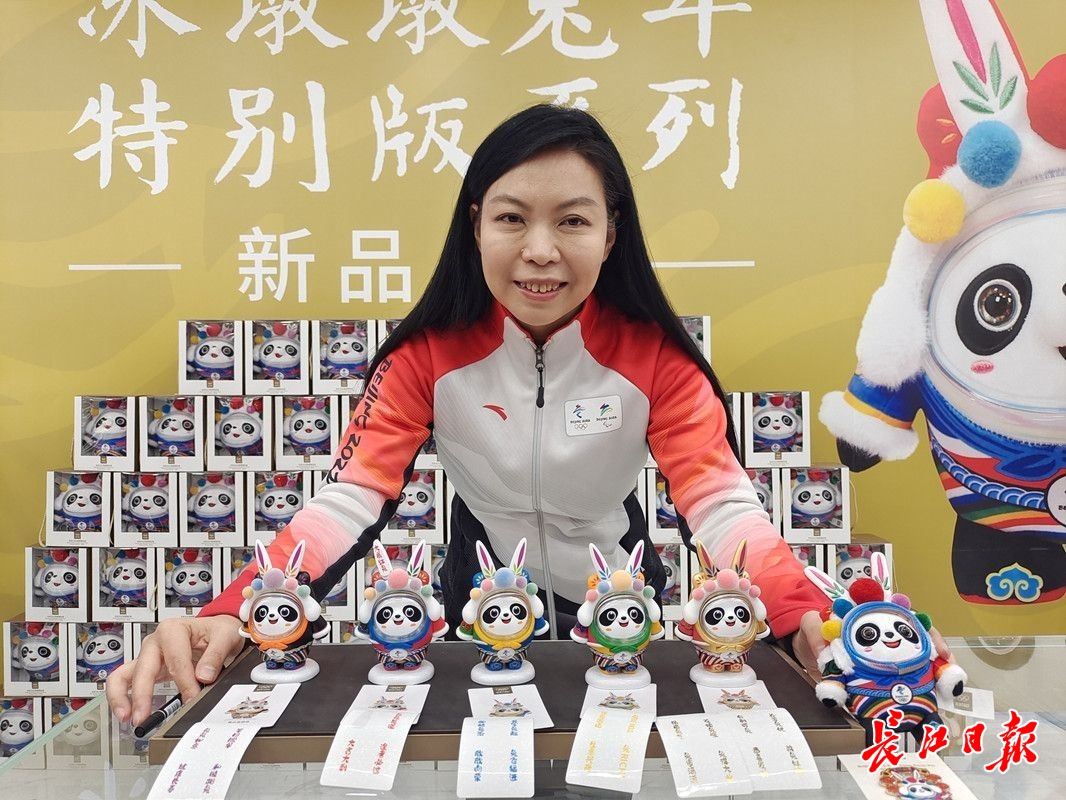 收藏了5000多件奥运吉祥物及相关纪念品的“奥运小王子”张文全来到销售现场。张文全请林存真在抢购到的“兔墩墩”上签名,并亮出自己珍藏的虎墩墩和太空航天版冰墩墩与“兔墩墩”同框留影。记者柯立 摄