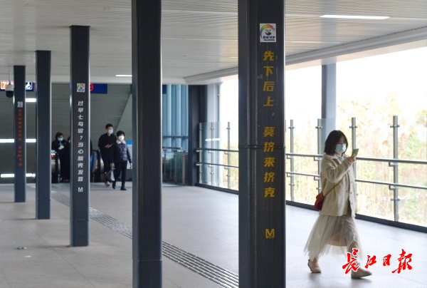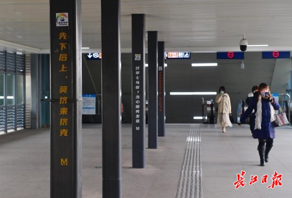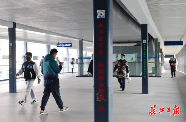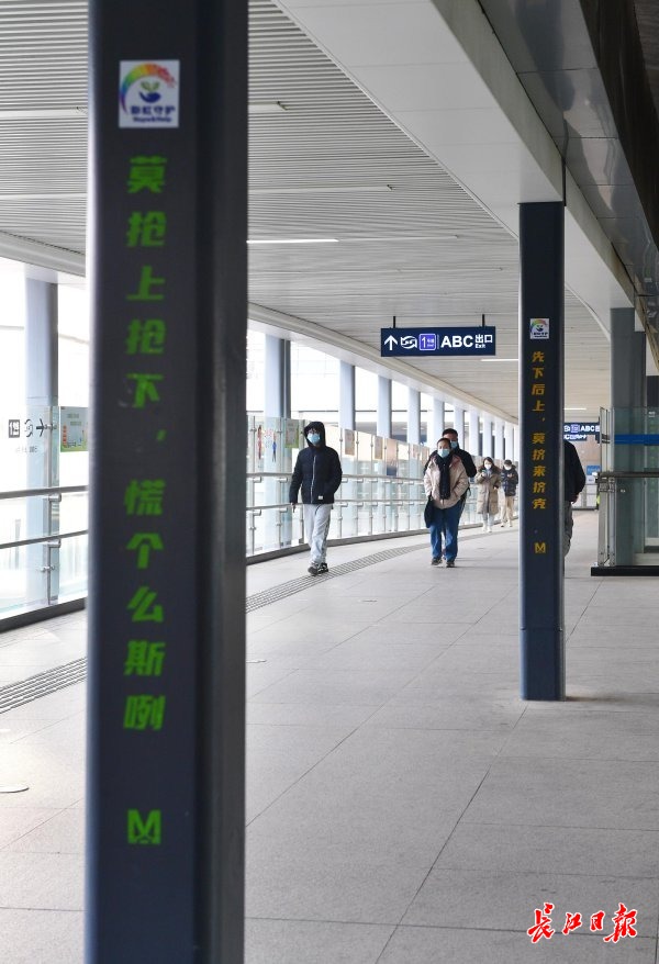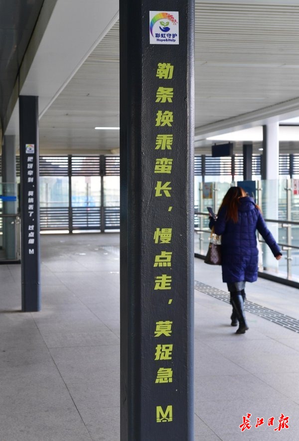 长江日报大武汉客户端12月29日讯 12月29日,武汉地铁三阳路站1号线与7号线的高架换乘通道内,一根根铁灰色的立柱上张贴着各种颜色的宣传语,“注意站台缝隙,jio卡在豆里就麻烦了”“拿好随身物品,丢了就掉得大”“莫吸烟,客垃圾桶把烟灭了”“把伢牵到,莫搞丢了,过点细”、“莫在车站内吸烟,打赤巴,脱hai子”、“莫挖到脑壳玩手机,当心jio下”……一句句武汉方言,让路过的乘客忍不住默念起来,会心一笑。