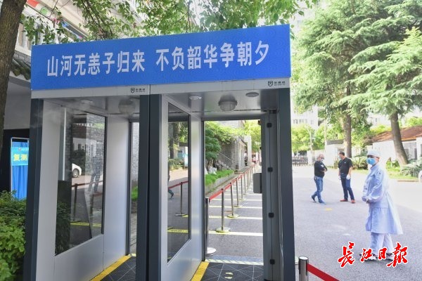 18日,武昌文华中学门前,校方设置的测温消毒通道 记者 苗剑 摄