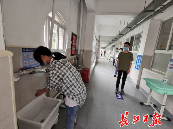 友谊路中学初三学生返校,入班前先洗手。