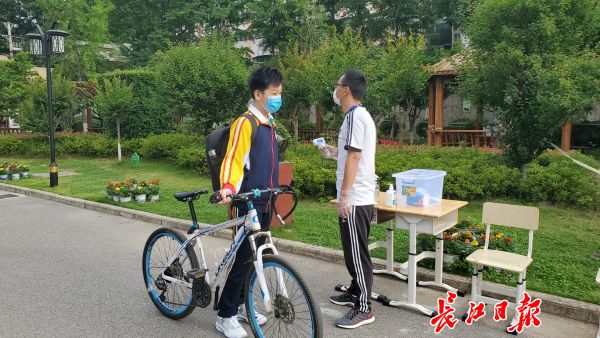 在武汉市南湖中学,学校实行人车分流,走路来校和骑车来校学生分别从不同的通道接受测温,然后进入校园。