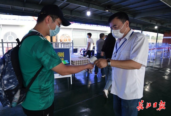 长江日报-长江网5月21日讯 5月20日傍晚,武汉港23号码头,乘坐长江观光游船的游客佩戴口罩进入码头,游客上下船时保持1米距离,游船工作人员查验健康绿码并测量体温,游客们自觉地在空旷的甲板上乘坐欣赏长江夜景。(记者李子云 摄影报道)