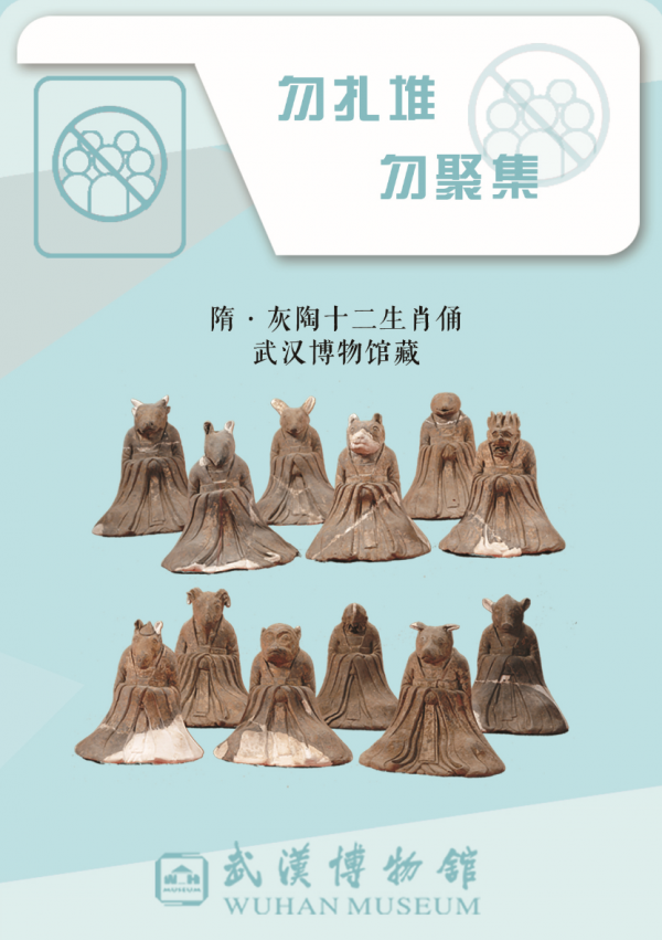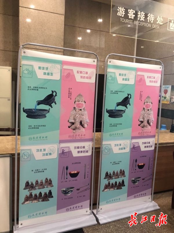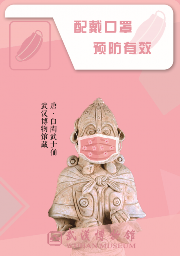 目前,这组文物“防疫宣传大使”海报组图,已在馆内游客接待处、文创商店等多处设置,提醒参观者注意防疫,还计划在武汉多处地铁站和媒体亮相,同时设计相关文物的线上赏析和实物展览,以文博特有的方式为武汉的城市复苏贡献力量。