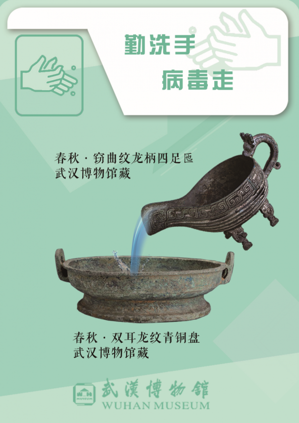 日前,武汉博物馆选取该馆8件(套)文物,赋予窃曲纹龙柄四足匜、白陶武士俑等馆藏精品新的文化内涵,使其化身防疫宣传大使,将底蕴深厚的文物精品和通俗易懂的健康防疫宣传语相结合,设计出四幅海报组图,提醒博物馆参观者和市民勤洗手、戴口罩、勿扎堆聚集、实行分餐制。