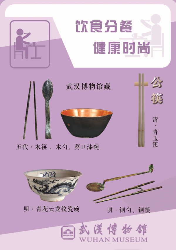 武汉博物馆馆藏的唐代“白陶武士俑”,隋代“灰陶十二生肖俑”,五代“木筷、木勺、葵口漆碗”,以及“明代青花云龙纹瓷碗”等珍贵藏品,也在设计师的巧手下,个个化身宣传防疫常识的“小能手”,用于为市民和观众普及疫情期间的必要防护措施。