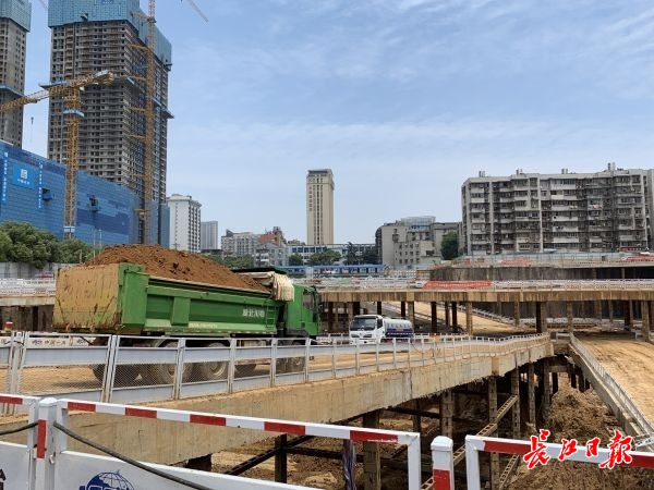 记者现场看到,虽然是白天,但工地内有8台渣土车在来回运土。施工方负责人解释说:“出土点正好位于居民楼旁边,为了减少夜间噪声,我们白天先在工地内部转运,把土运到工地另一处距离居民楼较远的地方,夜间再外运,减小夜间对居民的噪声影响。”