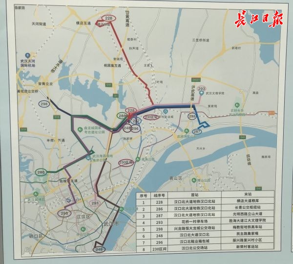 293路:首末站由花桥一村停车场至胜海大道江大文理学院园博金银湖南街场站至王家墩泛海城市广场,线路走向为:黄孝河路经发展大道、金桥大道、汉口北大道、胜海大道,单程线长22.55公里,配车26台。