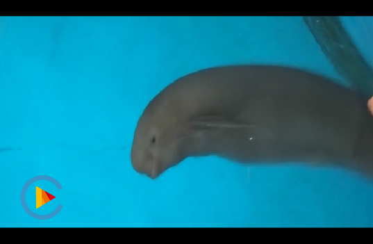 中科院水生所副研究员 郝玉江博士:江豚和我们人类一样,是哺乳动物,虽然生活在水里面,但是它要不停地出水呼吸,而且小江豚生出来第一个动作就是要出水呼吸。生出来以后,脐带没断开就非常危险了,小江豚被脐带拉扯,游不上来,没法呼吸,当时训练员看到这个情况以后,尽快跳到水里面,直接用手把小江豚托出水面。让它呼吸了第一口新鲜空气。