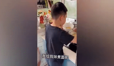 视频中,妈妈一早醒来感觉有点头晕迷糊,在床上休息一会儿之后怕家里的两个孩子挨饿,还是忍着头晕走到厨房准备给孩子们做饭。没想到却被眼前的一幕暖化了原来小男孩早已经在厨房为妹妹煮好面。
