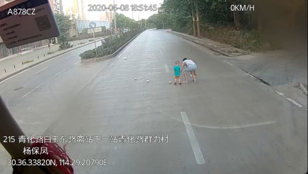 杨保凤往不远处仔细一看,发现几个娃哈哈饮料瓶从前方岔路口滚落到马路中央,紧接着,有个两三岁的男童一下子冲上了机动车道。危险时刻,她赶紧按下喇叭并快速踩住刹车,最终车辆在距离男童2米远处停住。