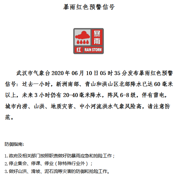 6月10日清晨5时35分,武汉市气象台再度发出暴雨红色预警信号:过去一小时,新洲南部、青山和洪山区北部降水已达60毫米以上,未来3小时仍有20-40毫米降水,阵风6-8级,伴有雷电。