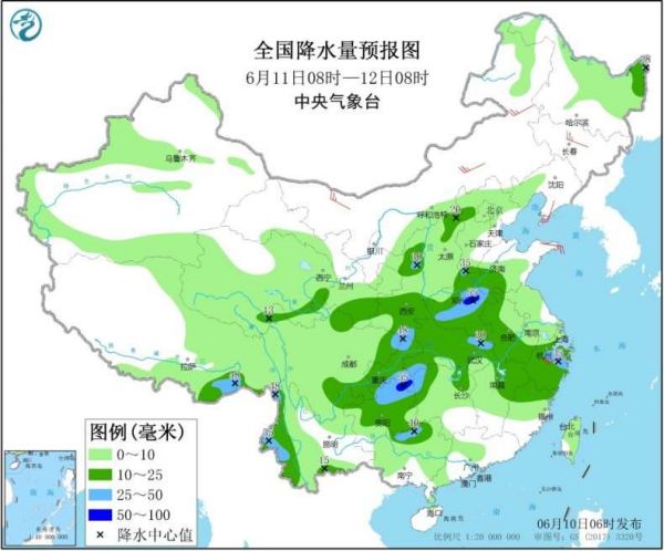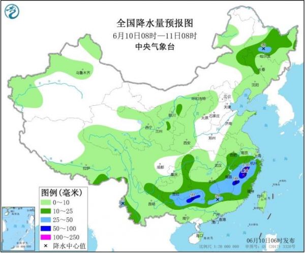预计,6月10日08时至11日08时,广西北部、广东北部、贵州南部、湖南南部、江西中东部、福建西部、浙江中西部、安徽南部以及黑龙江南部、云南西部等地的部分地区有大雨或暴雨,局地大暴雨(100~140毫米)。上述部分地区伴有短时强降水(最大小时降雨量30~50毫米,局地可超过60毫米),局地有雷暴大风等强对流天气。中央气象台6月10日06时发布暴雨蓝色预警。