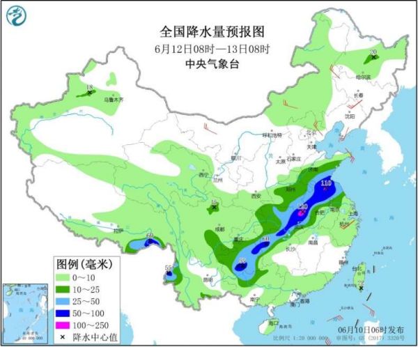 6月12日08时至13日08时,黄淮大部、江淮大部、江汉、西南地区东部、江南西北部、华南西北部等地的部分地区有中到大雨,其中,山东南部、江苏北部、安徽北部、河南东南部、湖北东部、湖南西北部、贵州东部和南部等地的部分地区有暴雨,局地大暴雨(100~120毫米)。内蒙古大部、东北地区南部等地的部分地区有4~5级风。