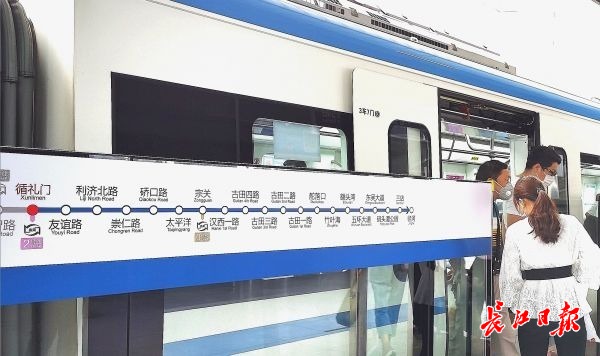 长江日报-长江网记者现场看到,十块屏蔽门分别依次张贴“循礼门站”站名、“往径河(汉口北)方向”字样以及沿途站点名称:前往的方向为黑色,过往方向为灰色,当前站为红色,内容和地下地铁站的规律是一样的。