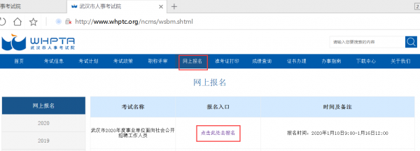 一、登录武汉人事考试网(www.whptc.org),并点击“网上报名”栏目。推荐使用谷歌浏览器或者360浏览器的极速模式。