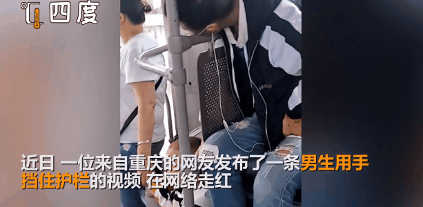 男生就默默用手挡在了护栏上