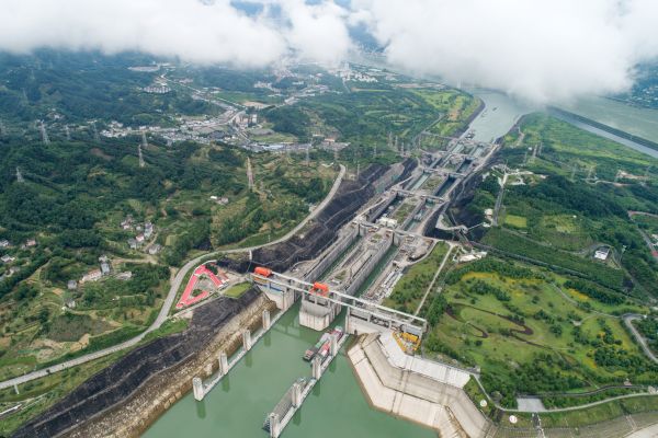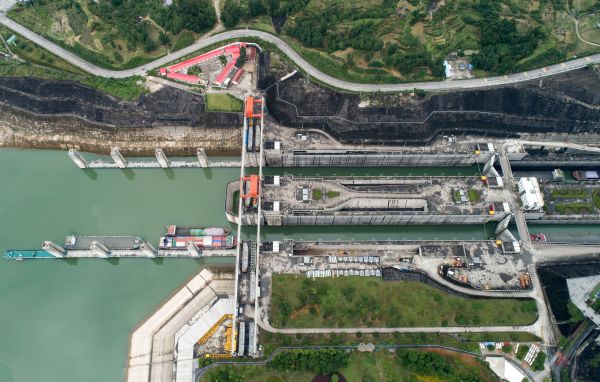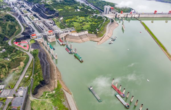 6月18日在大坝上游拍摄的稳健运行的三峡船闸(无人机照片)。