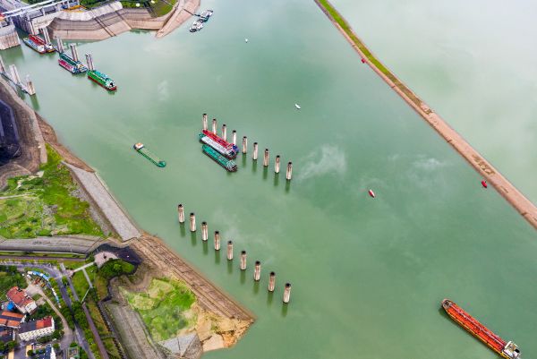 6月18日,船舶行驶在三峡五级船闸上游引航道(无人机照片)。