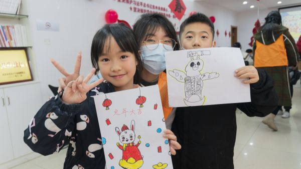 “老师,这个兔子怎么画呀?”“老师,兔子是四只腿还是两只腿?”“老师,兔子有几颗牙齿啊?”小朋友们在画兔年的兔子时,各种问题抛向志愿者。艺中南志愿服务队队长张钰媛和团队成员,一一回答小朋友的提问,并给小朋友强调纪律,“大家一个一个举手提问,你们的‘十万个为什么’,我们一个个回答。”