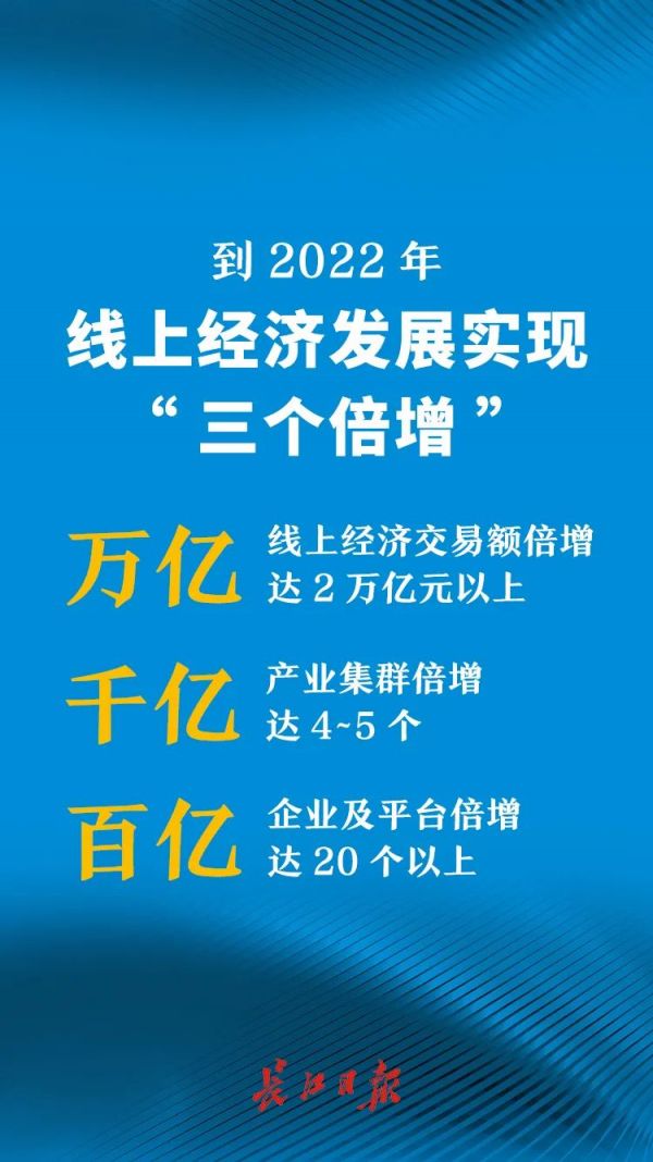 武汉市计划,到2022年,线上经济发展实现“三个倍增”:即万亿线上经济交易额倍增,达2万亿以上;千亿产业集群倍增,达4-5个;百亿企业及平台倍增,达20个以上。