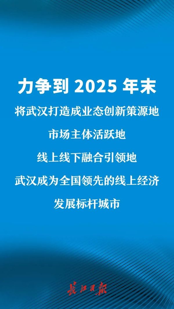 力争到2025年末,将武汉打造成业态创新策源地,市场主体活跃地,线上线下融合引领地,武汉成为全国领先的线上经济发展标杆城市。