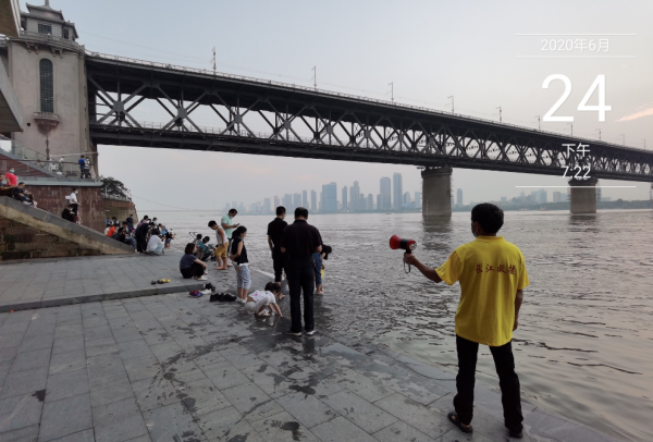 不远处,武汉长江志愿救援队汉阳门支队队长张汉平和其他14名队员正在此值守,他们不让未成年人独自靠近长江,如有人溺水,将会第一时间赶往救援。