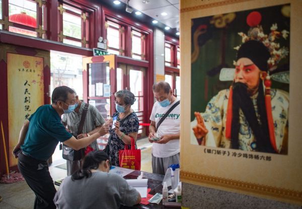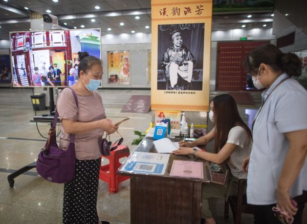 6月26日,市民测体温、扫健康码登记后进入武汉市人民剧院。