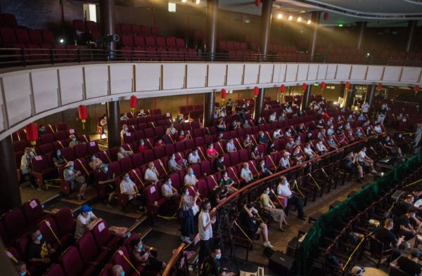 26日,武汉市中心7家剧场恢复开放,各大文艺院团恢复线下演出,市民再次坐在剧场内观看“戏码头”上群星云集、百戏荟萃。新华社记者 肖艺九 摄影报道