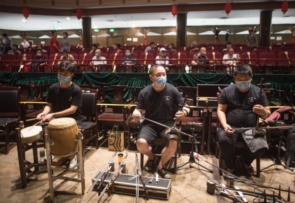 6月26日,在武汉市人民剧院,三弦演奏者在演出前准备。
