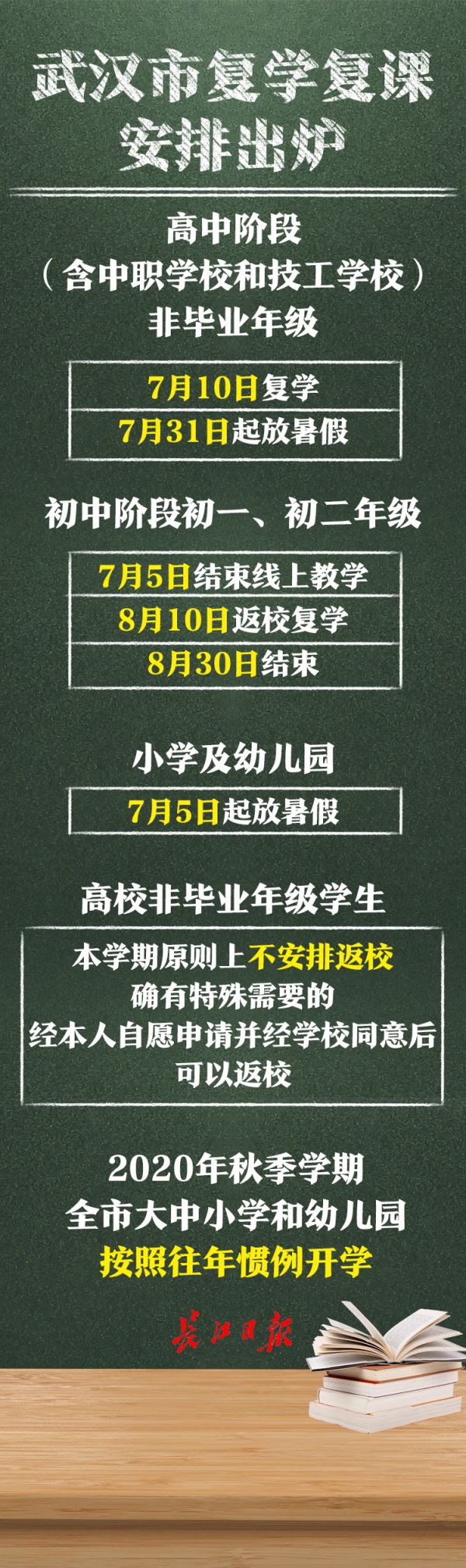 记者从新闻发布会上获悉,武汉市复学复课安排出炉:高中阶段(含中职学校和技工学校)非毕业年级7月10日复学,7月31日起放暑假;初中阶段初一、初二年级7月5日结束线上教学,师生休假,8月10日返校复学至8月30日结束;小学及幼儿园7月5日起放暑假;高校非毕业年级学生本学期原则上不安排返校,确有特殊需要的,经本人自愿申请并经学校同意后可以返校。2020年秋季学期,全市大中小学和幼儿园按照往年惯例开学。