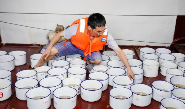 水文作业船上,长江清溪场水文站工作人员将水样采集铅鱼放入水中。